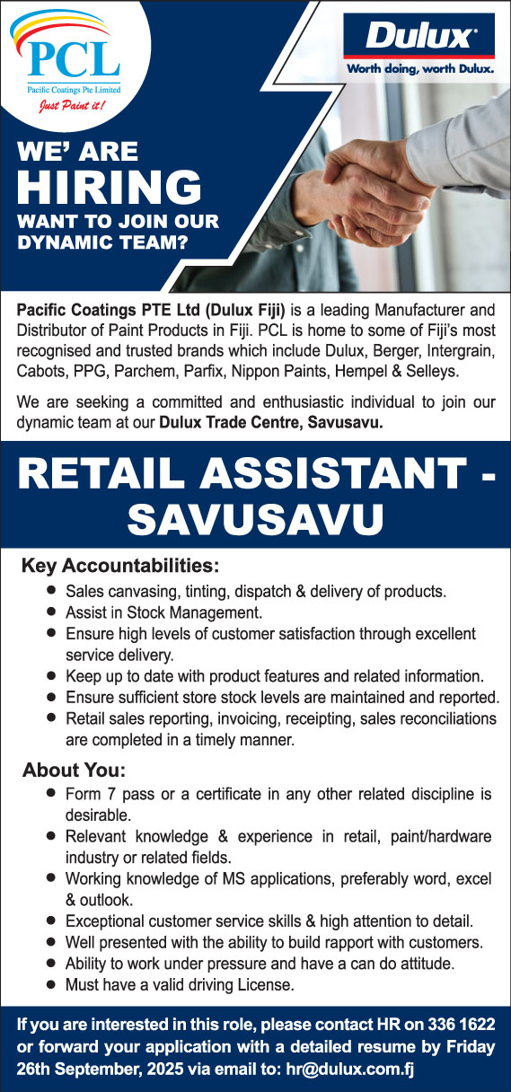 Retail Assistant Expired on: Sep 26, 2025 Job Type: Full Time Job Location: Savusavu Sorry! This job has expired. Share